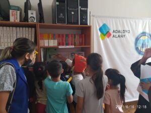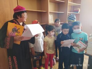 Балаларды кітапханада қазақ ертегілері мен аңыздарының кейіпкері Алдар Көсе қарсы алып, ойын аялдамаларына бағыттады.