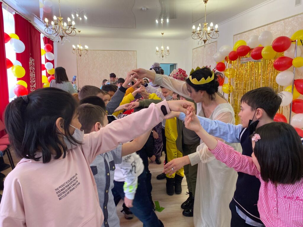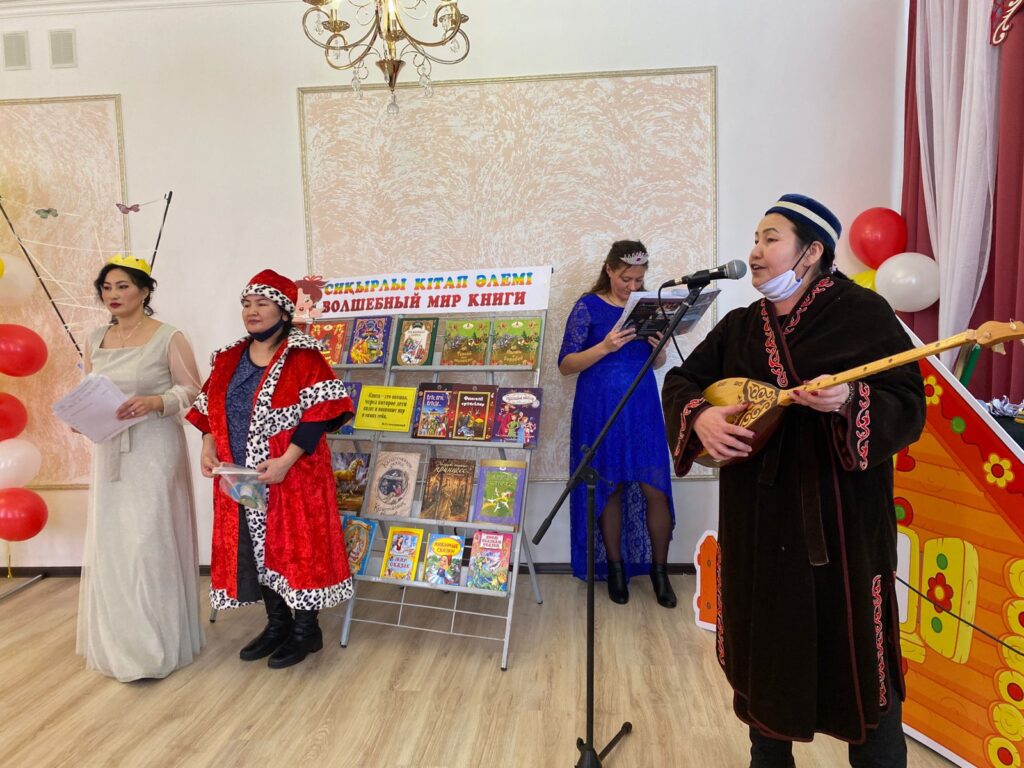 Жас қонақтарды ертегіші қарсы алып, «Сиқырлы кітаптар әлемі» атты символикалық атаумен безендірілген жарқын кітап көрмесінің сөрелерінен балаларға қарап тұрған ертегілер әлеміне енгізді.